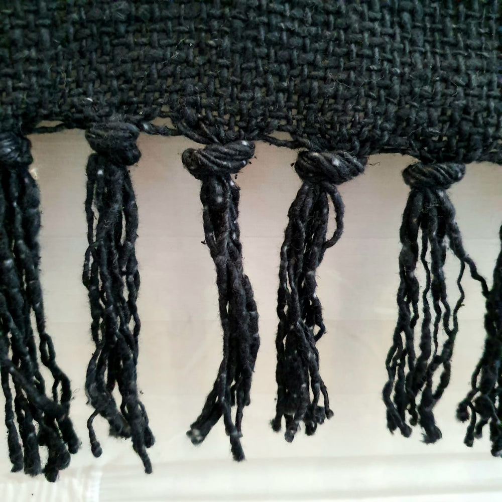 This elegant cotton throw is crafted from natural raw cotton in a soft black shade, detailed with a white zigzag stitch pattern that adds texture and visual interest. The edges are finished with matching black cotton fringe, enhancing its refined handcrafted look.