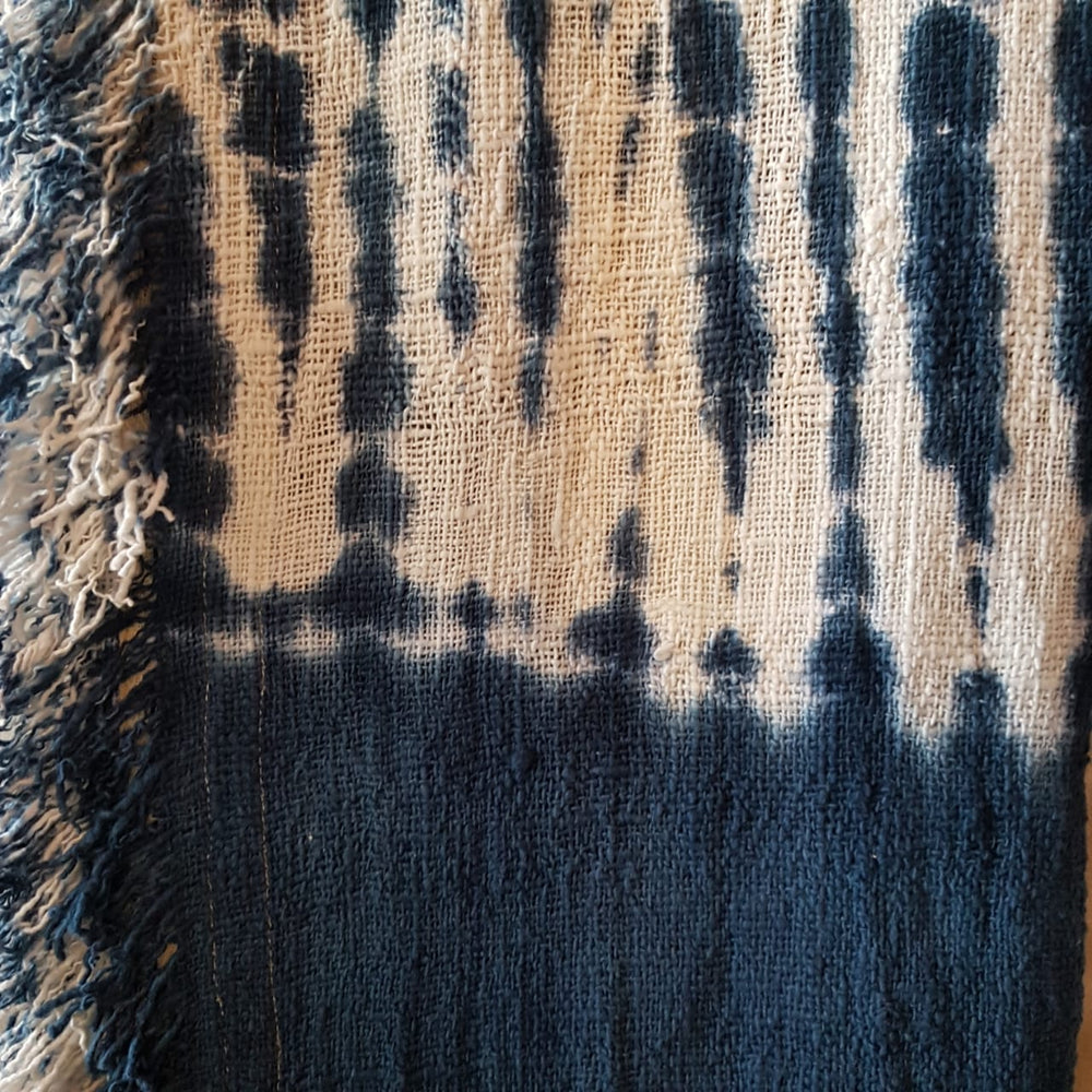 Crafted from soft raw cotton, this blue and white tie-dye throw features a natural dotted-line pattern that blends texture and depth beautifully. The short blue fringe along the edges adds a subtle handmade detail, enhancing its simple and elegant look.