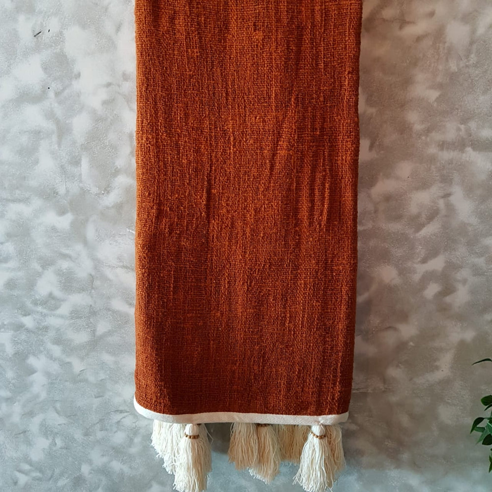 Crafted from 100% natural raw cotton, this luxurious throw features a beautiful brick red color that brings warmth, depth, and elegance to any interior. The natural white cotton hem and tassels with wooden beads add a handcrafted, organic touch — perfectly balancing simplicity and sophistication.