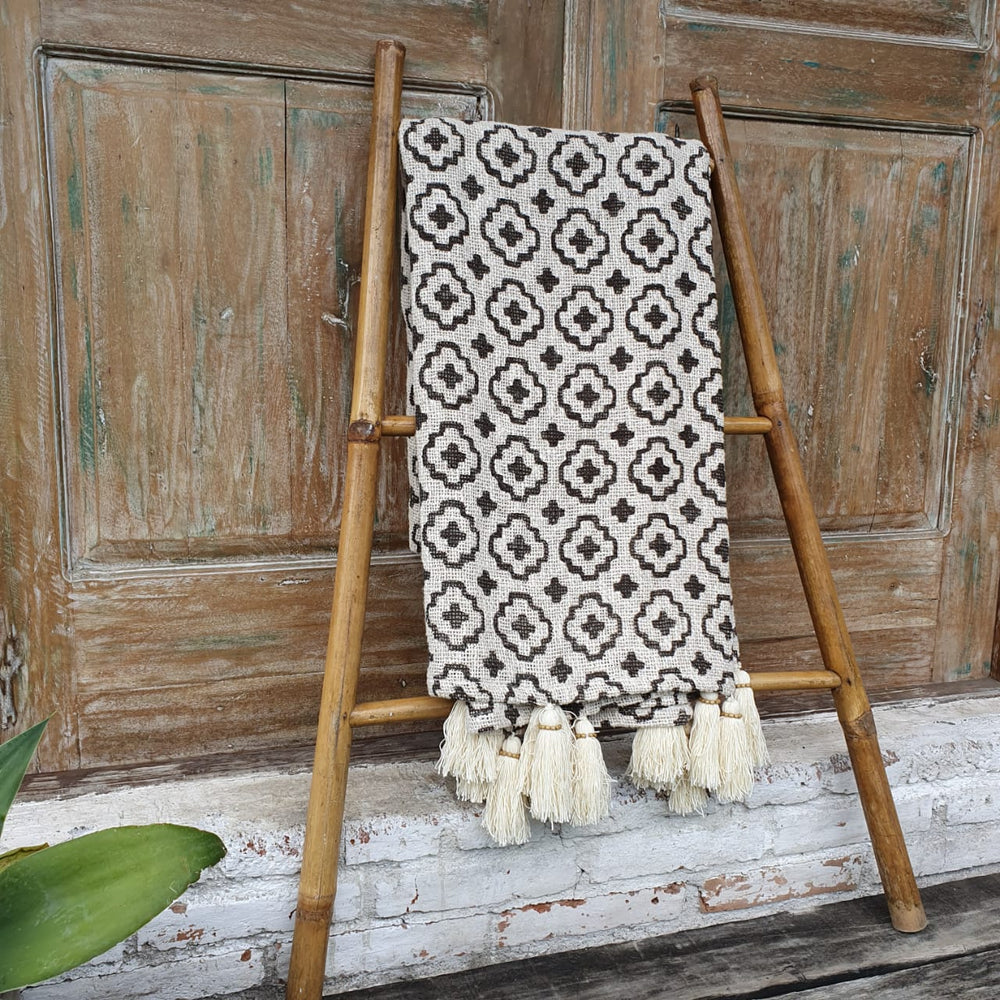 Hand-finished tassels on the edges add a subtle handcrafted detail that enhances its natural look. Made from undyed cotton fabric, the throw is breathable, medium in thickness, and suitable for use throughout the year.