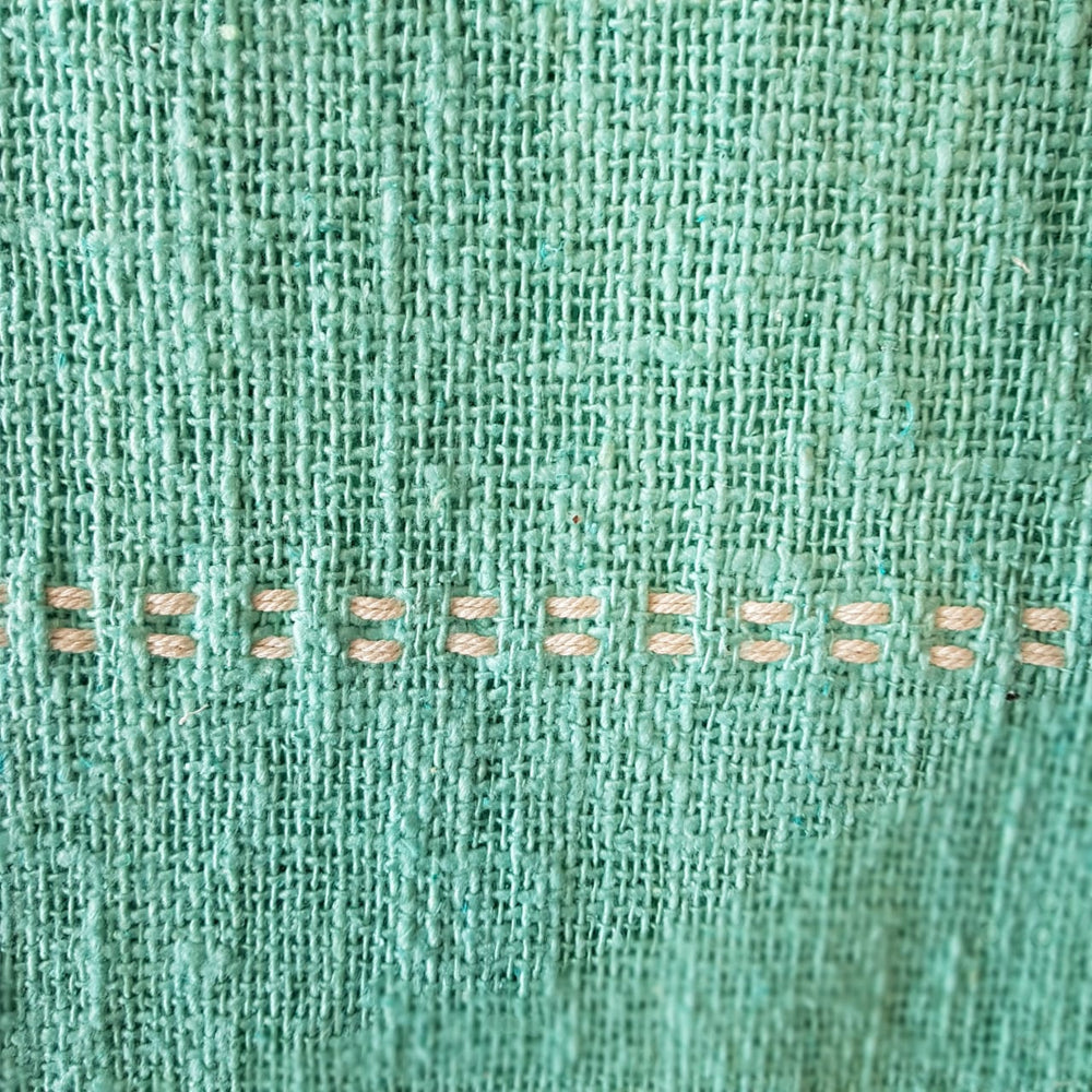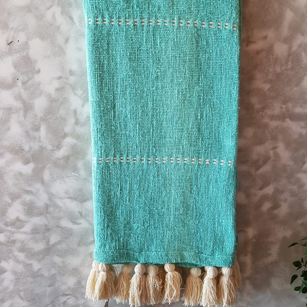 This soft light blue cotton throw features white stitched detailing along the edges and delicate white tassels. Made from high-quality raw cotton, it feels gentle and breathable, ideal for year-round use.