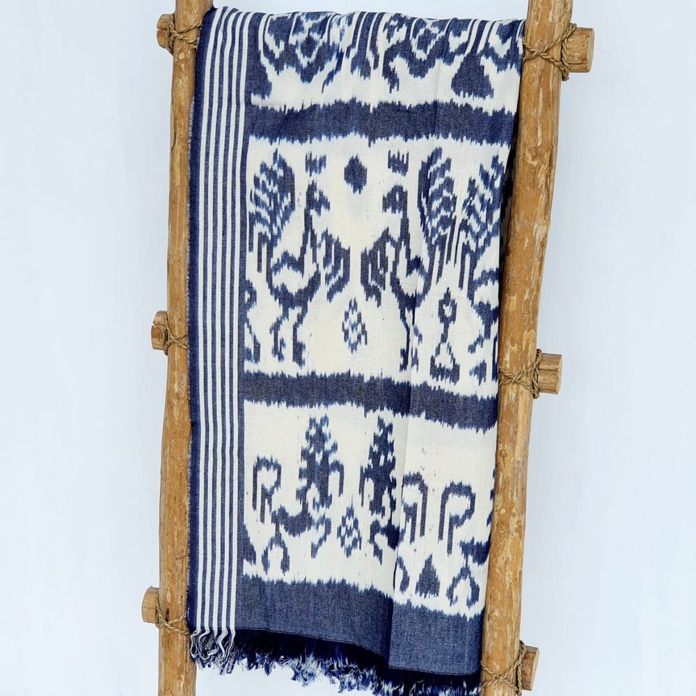 This elegant woven throw showcases a beautiful combination of blue and white tones with intricate traditional-style motifs. Made from soft woven fabric, it features fine patterns that add depth and charm to any space. The edges are finished with short cotton fringe, giving it a natural and handcrafted look.