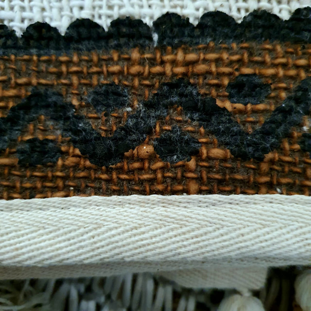 This cotton throw features a woven design in black, natural, and soft orange tones. Accented with black or natural tassels, it brings a warm and balanced look to your home.